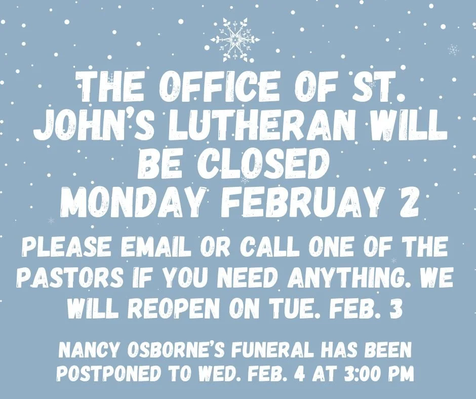 St. John's office will remain closed on Monday as we await roads, sidewalks and parking lots to be cleared of snow. All regular church activities should resume on Tuesday, but please contact the pastors by email or phone if you need any assistance.